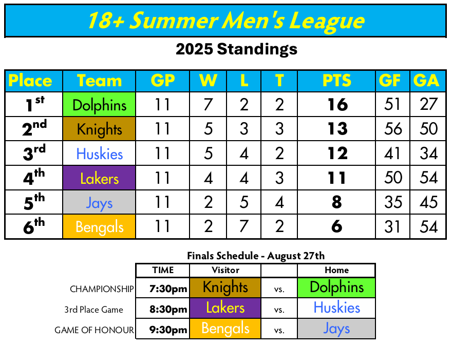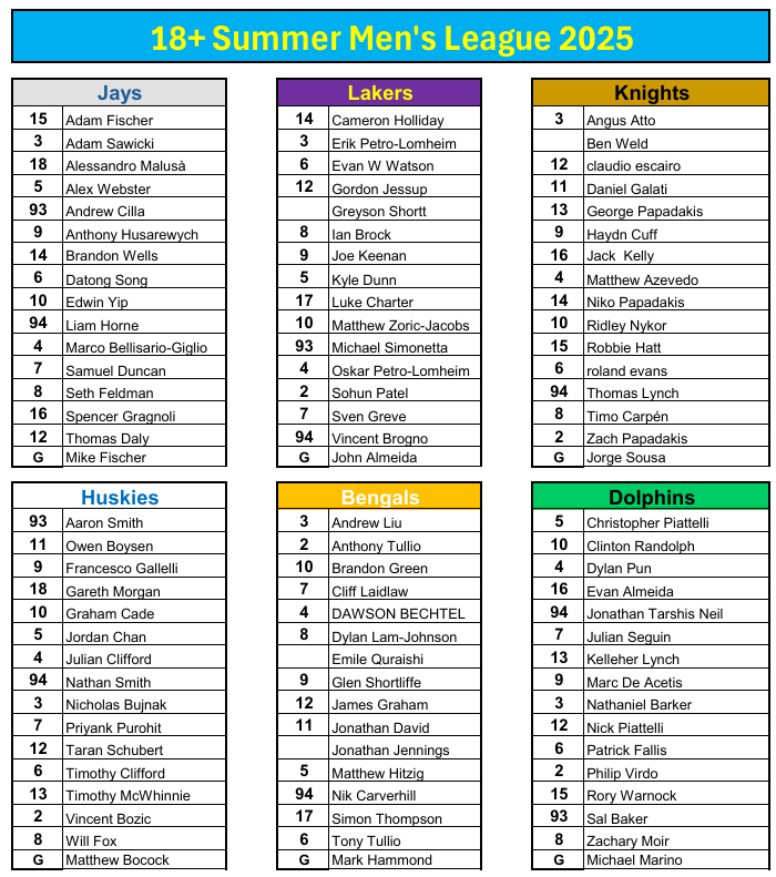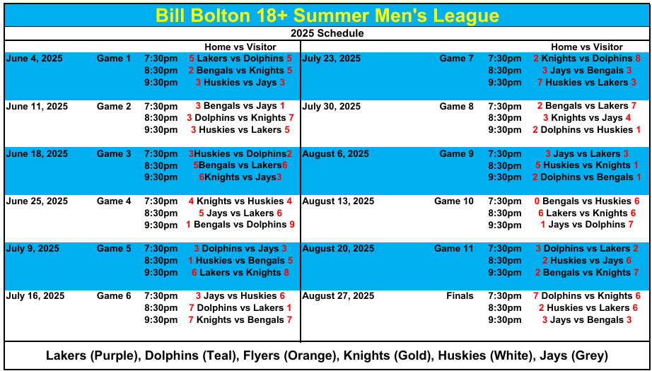 Your homepage for all the information you need to follow the Bill Bolton 18+ Summer Men's League